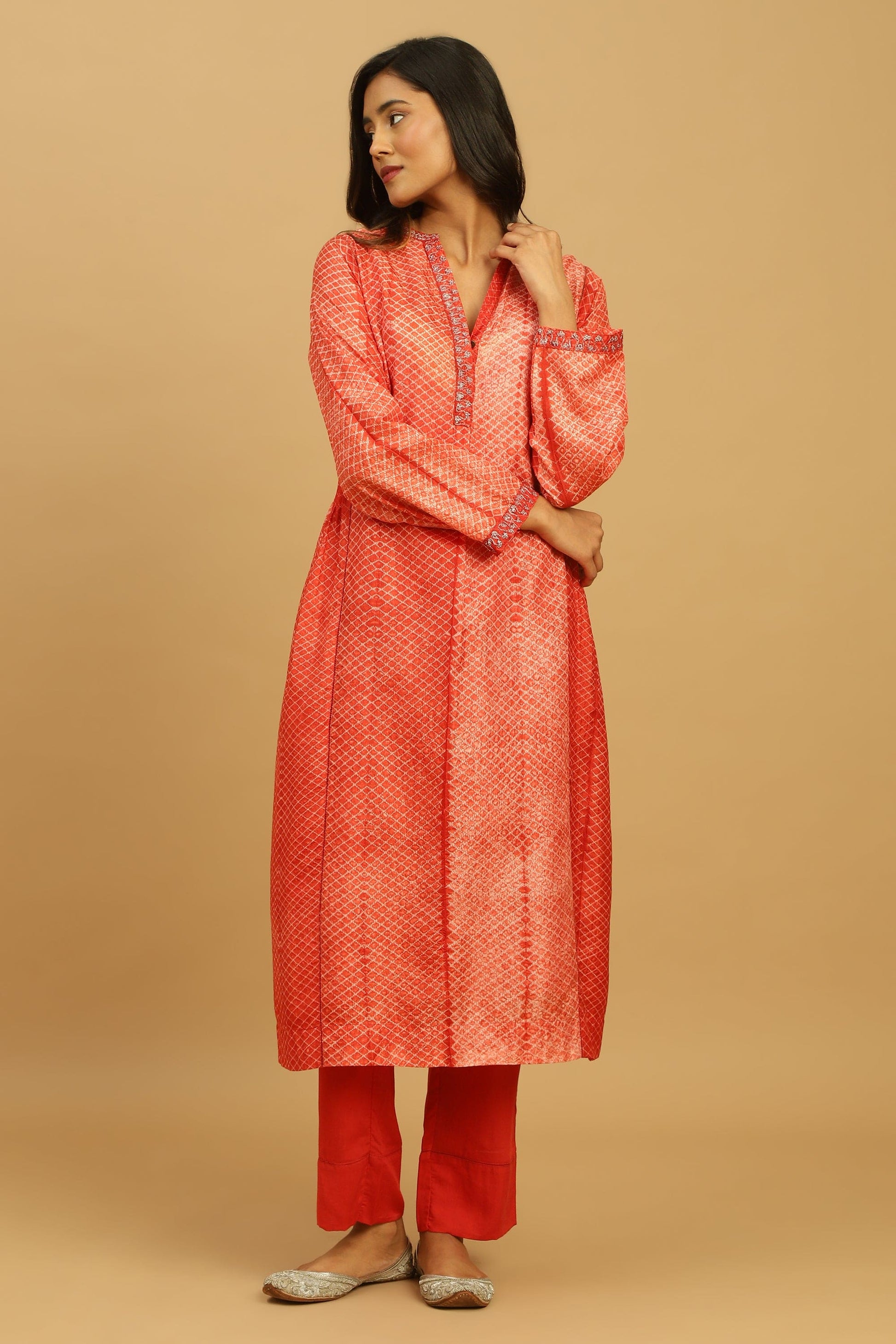 Yumi's Artisanal Clothing is hand dyed Shibori on fine silk by our women artisans. The Tunic set of a delicately embroidered tunic with tila work on the neckline and sleeve cuffs, hand dyed in shades of red. The tunic has pintuck details on the sides. It has a plain cotton silk draw string bottom.
