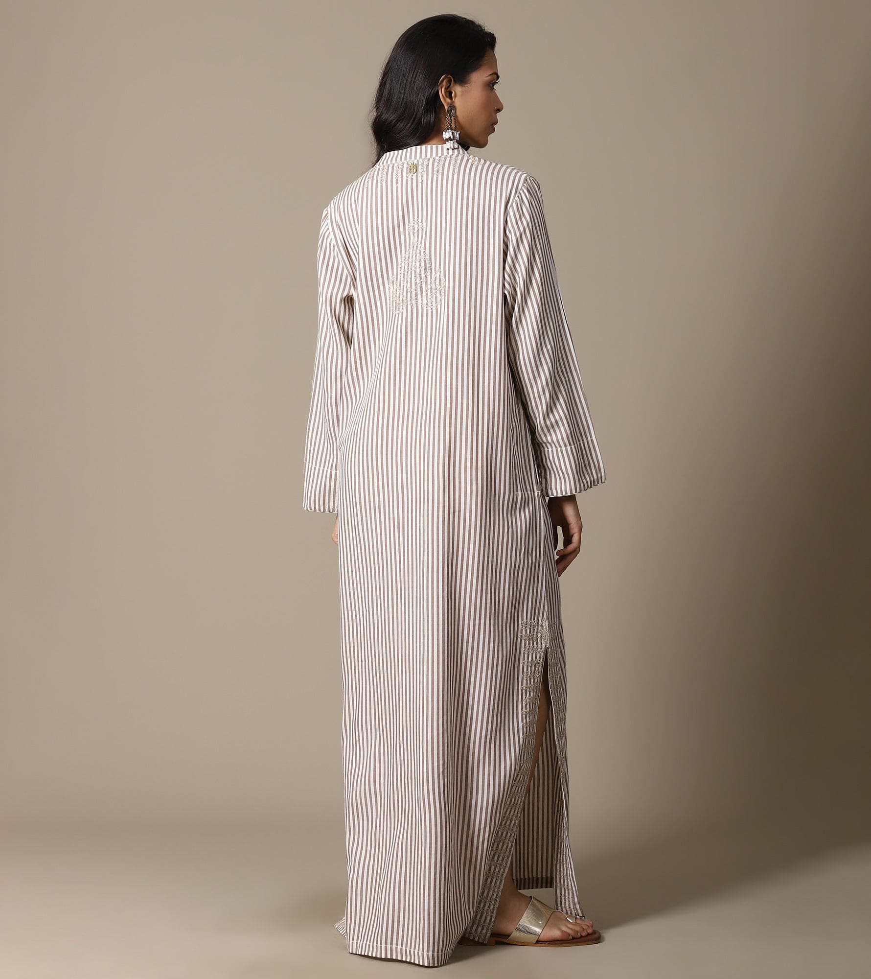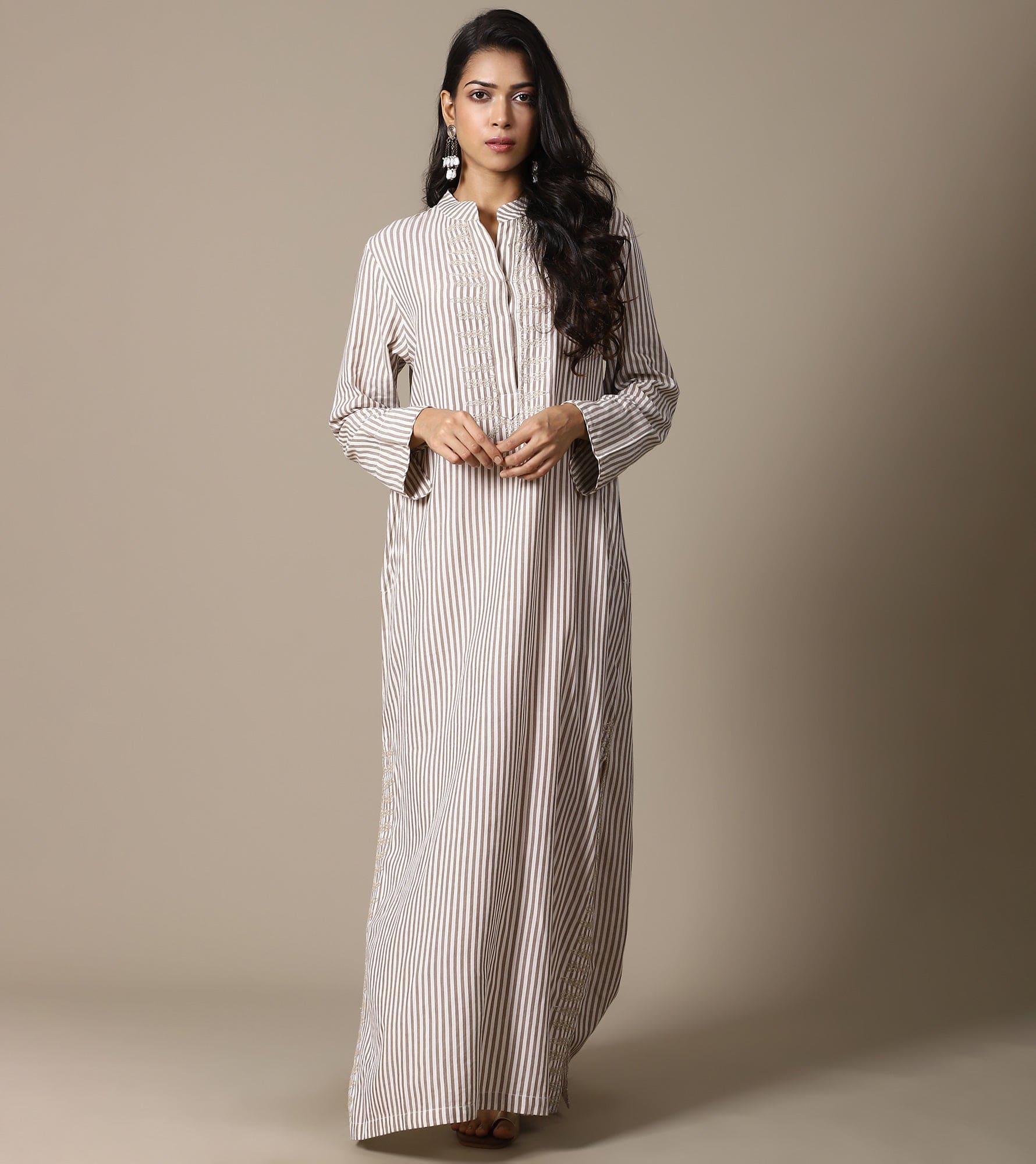 Yumi's Artisanal Clothing is a hand woven stripe Cotton Kaftan by our artisans. The kaftan is woven in natural shades of beige and embroidered delicately in ecru and gold thread. It has side pockets and is a chic and comfortable essential.