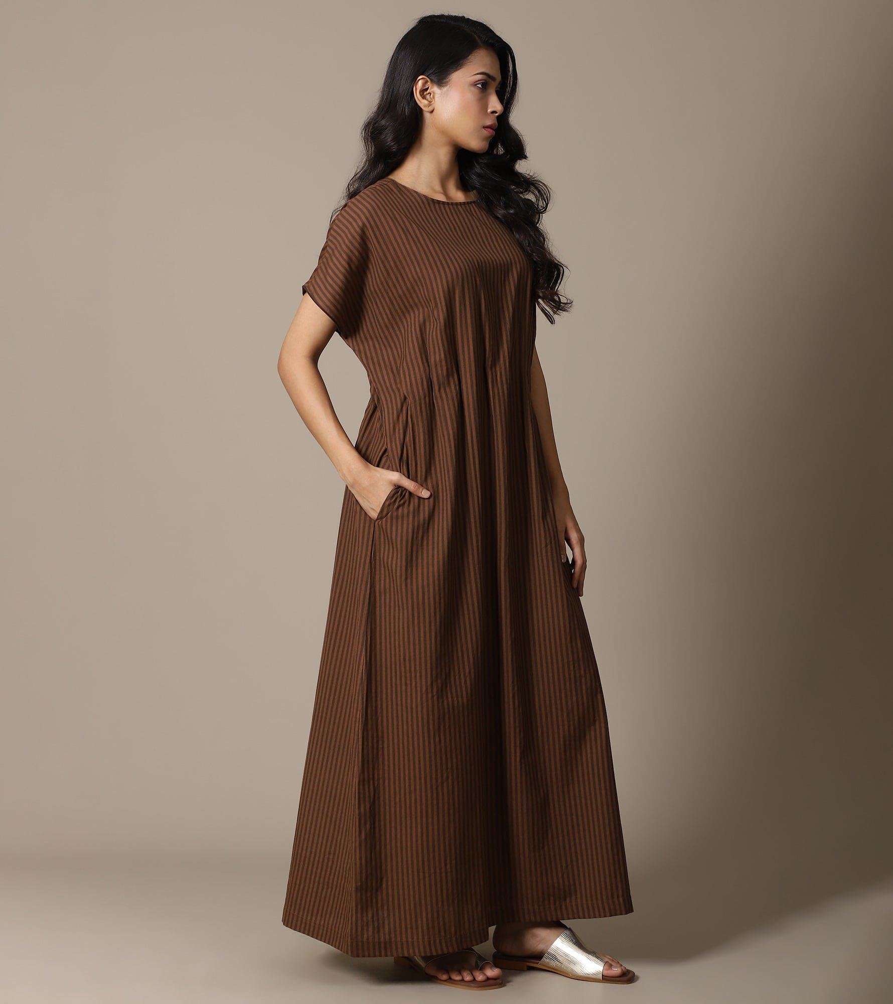 ORGANIC BROWN STRIPE PLEAT DRESS