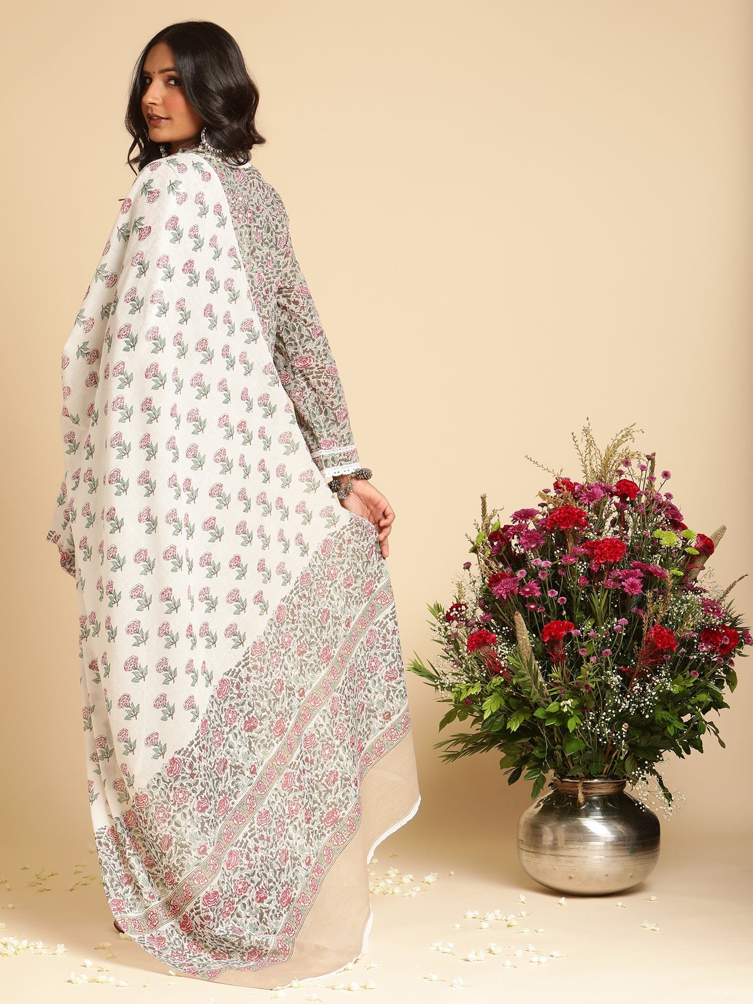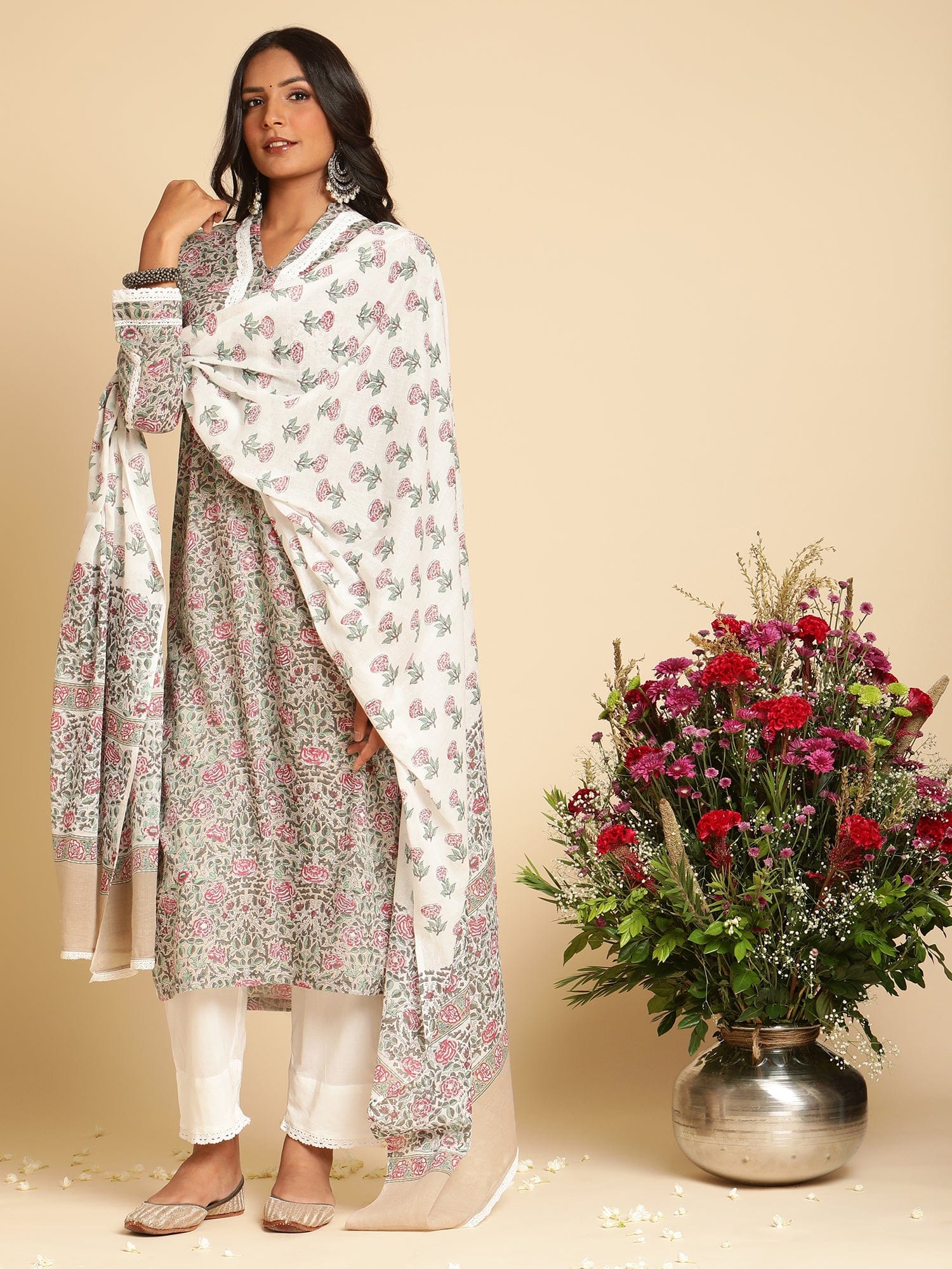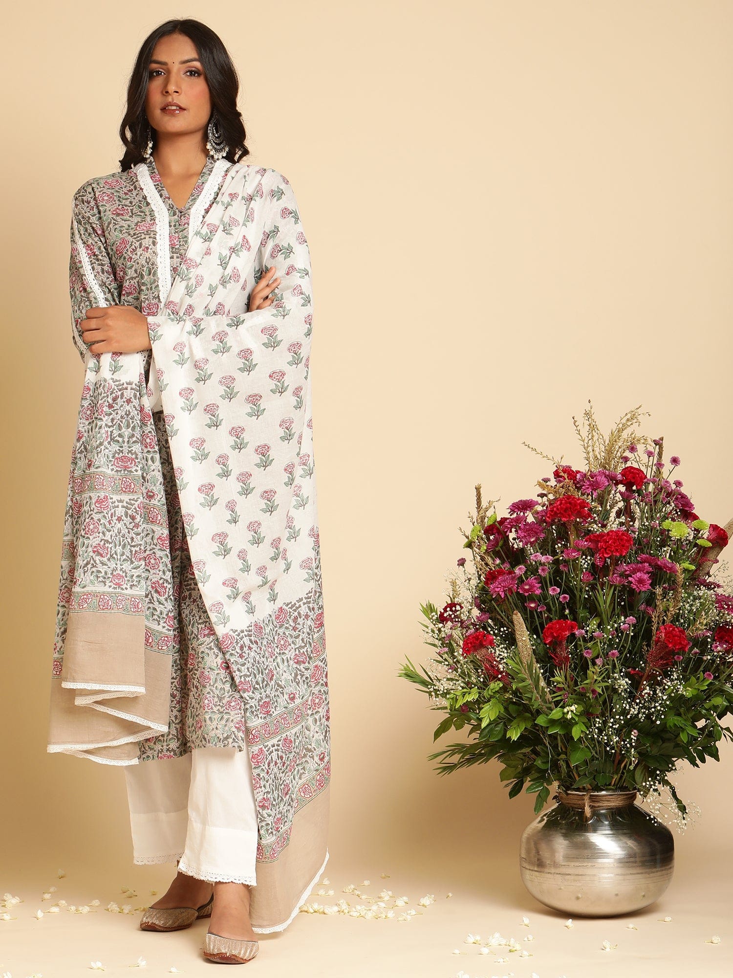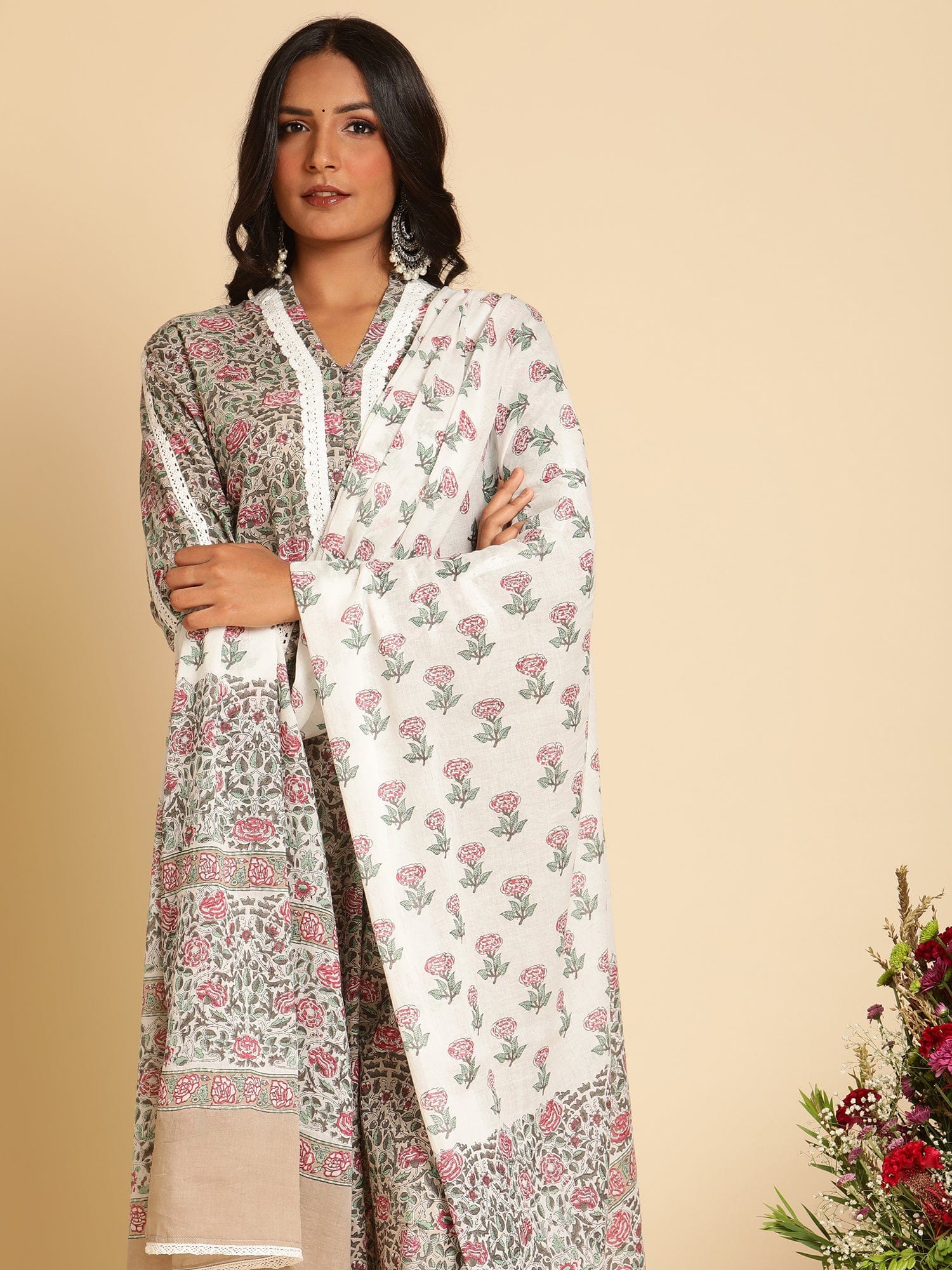 Taupe Rose Jaal Lace Cotton Hand Block Printed Kurta - (3 Pcs Set)