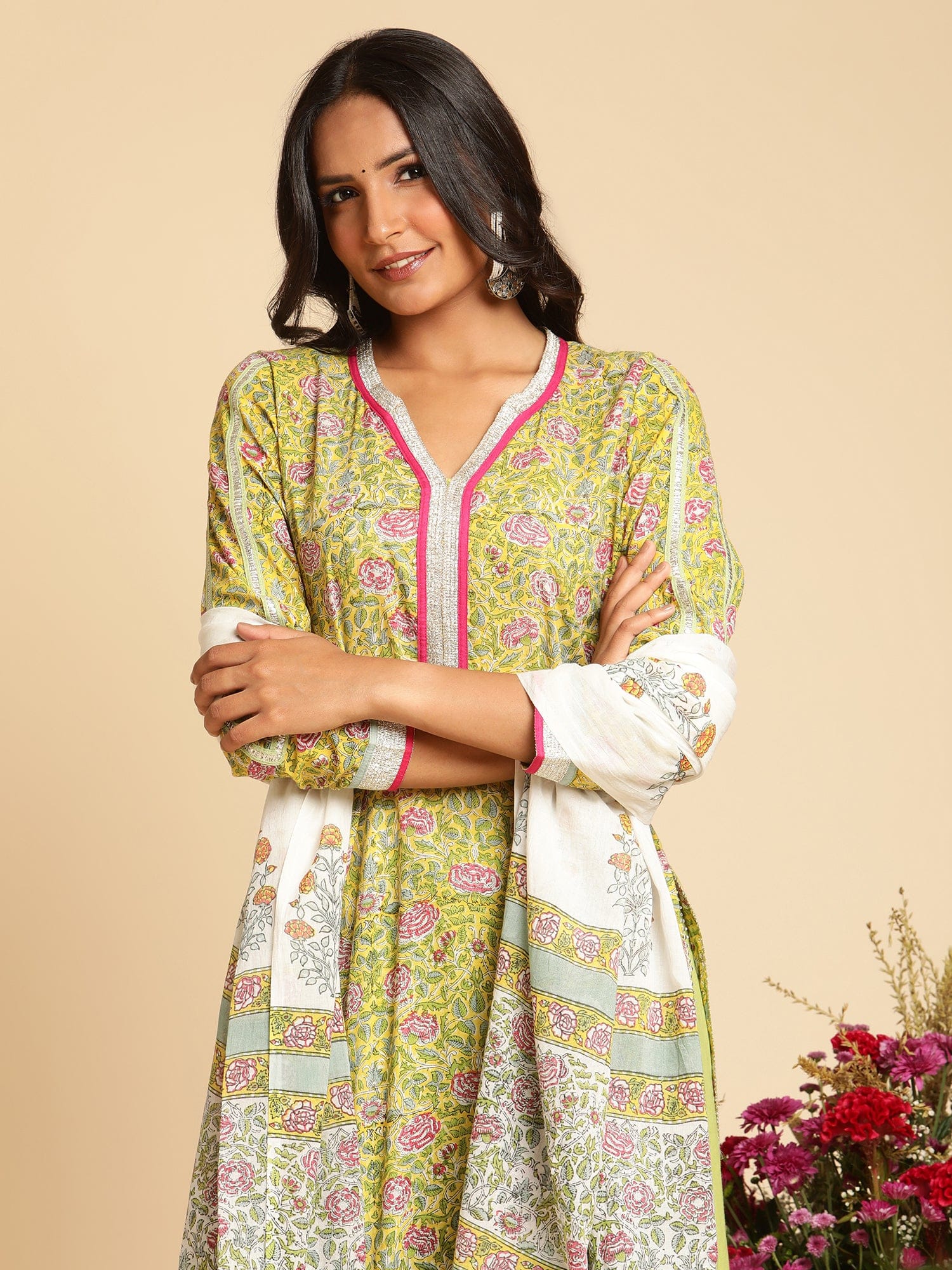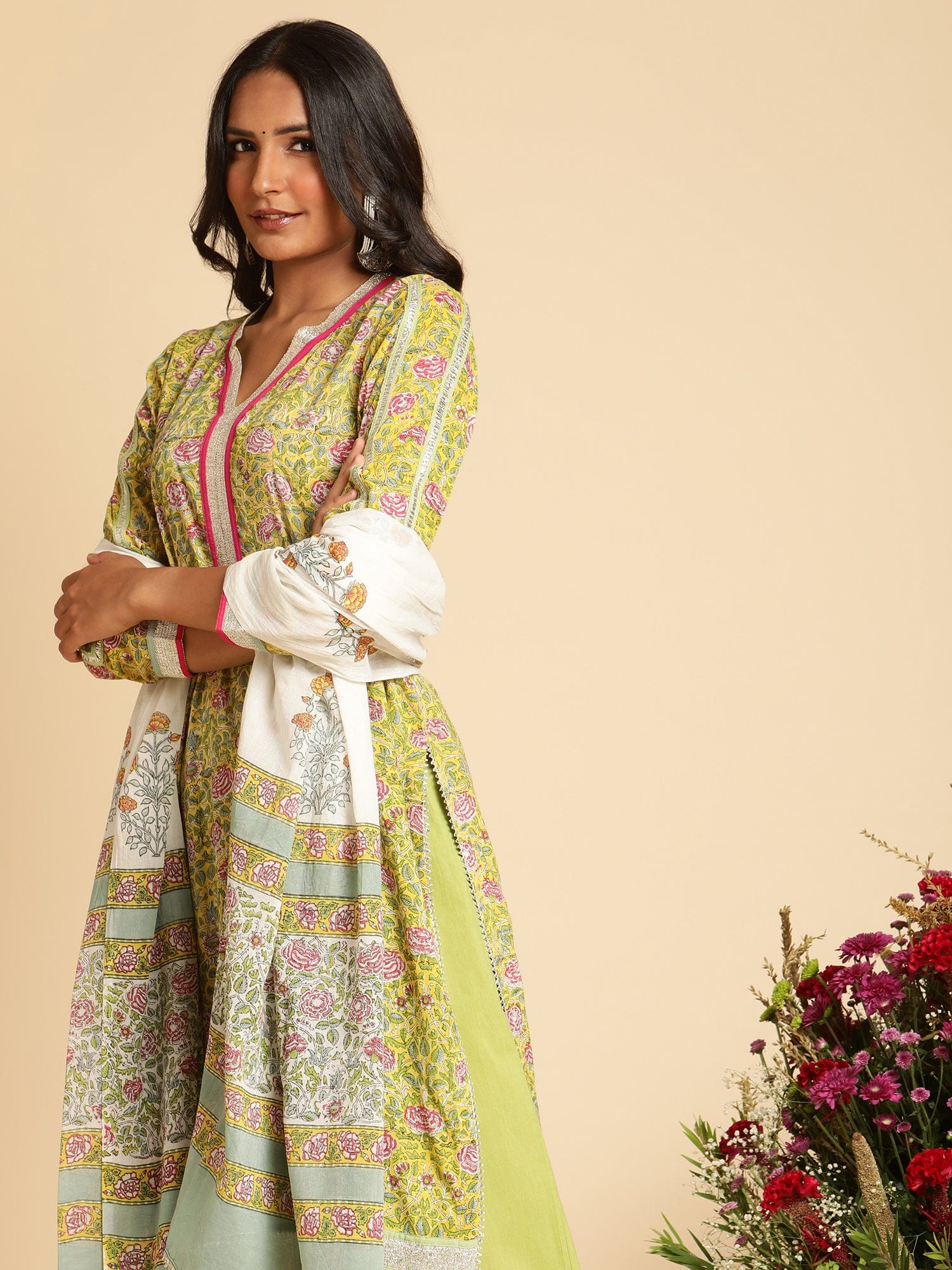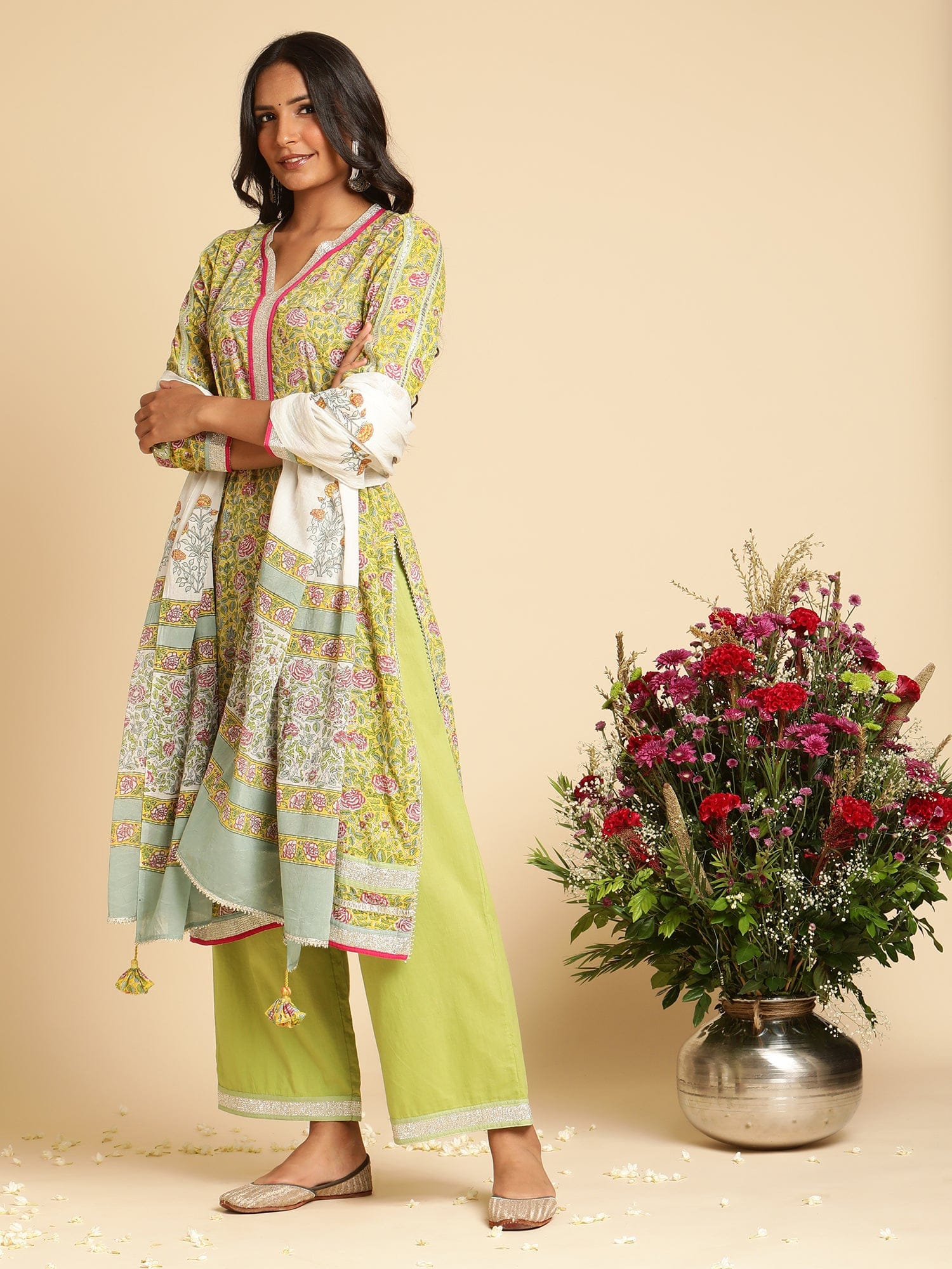 Yellow Rose Jaal Organic Cotton Hand Block Printed Kurta - (3 Pcs Set)