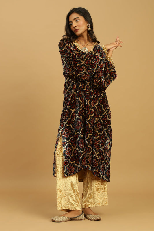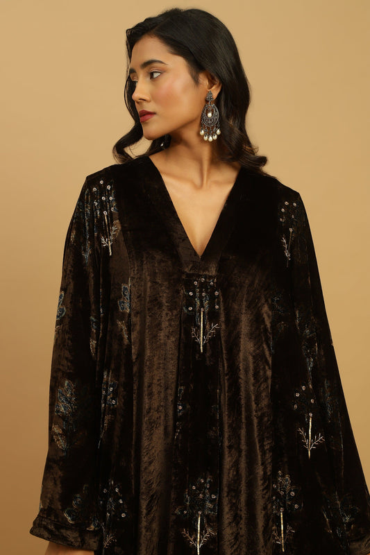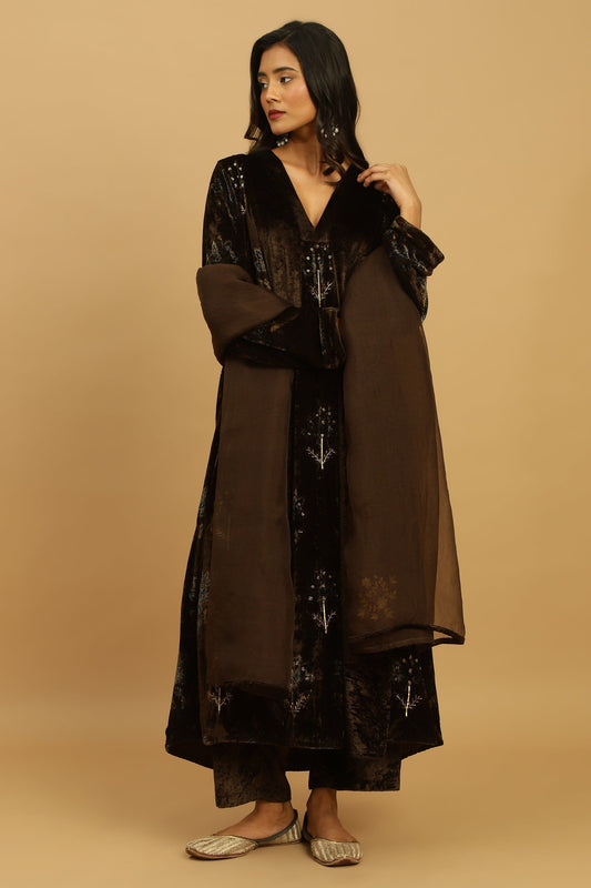 CHOCOLATE BOOTIE VELVET AJRAKH KURTA SET (3 Pcs)