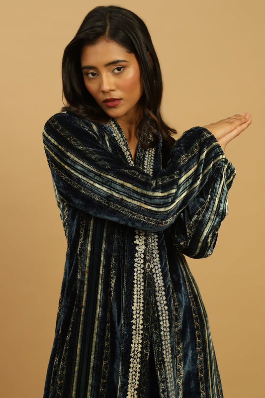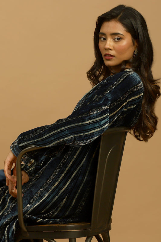 INDIGO PAISLEY STRIPES VELVET AJRAKH TUNIC JACKET SET